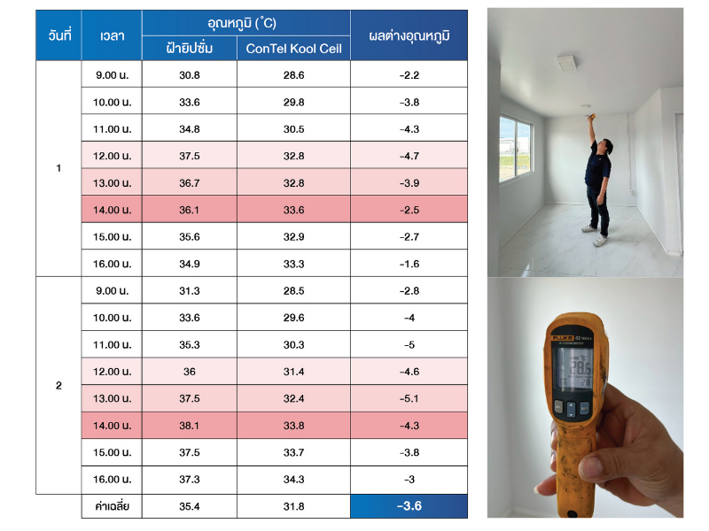 • ช่วงเวลาที่ร้อนที่สุด (12.00 – 14.00 น.): ConTel KoolCeil สามารถทำอุณหภูมิต่ำกว่าฝ้ายิปซั่มได้ถึง 5.1°C