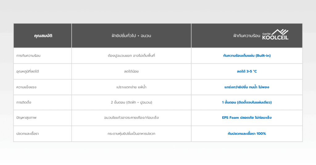 ตารางเปรียบเทียบ: ฝ้ายิปซั่มทั่วไป VS ฝ้ากันความร้อน ConTel Kool Ceil