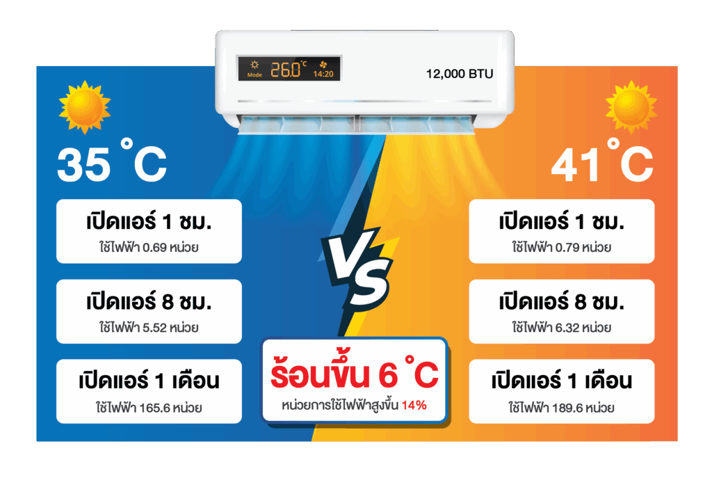 รู้หรือไม่? ยิ่งอากาศร้อน แอร์ยิ่งกินไฟ จากข้อมูลเปรียบเทียบการใช้ไฟฟ้าของแอร์ขนาด 12,000 BTU พบว่า: